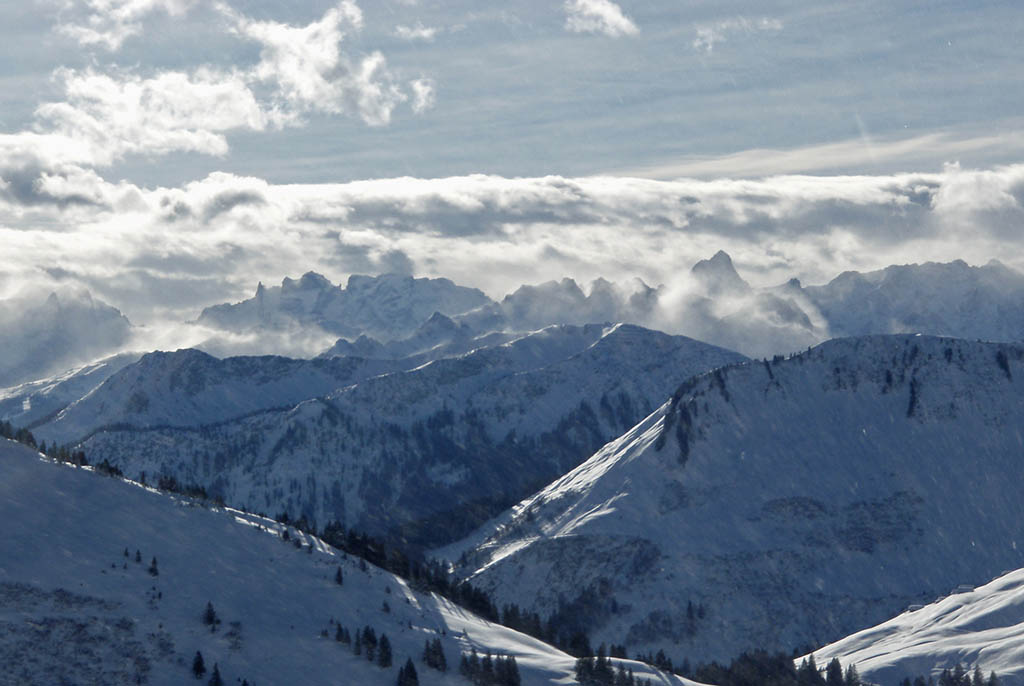 Auf Grund der Windankündigung gleich weiter mit der noch fahrenden Gipfelbahn Richtung Damüls. Die Aussicht ins Flachland war föhnbedingt schon ziemlich gut.
