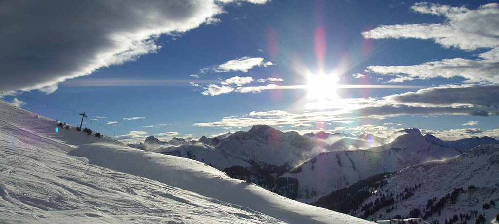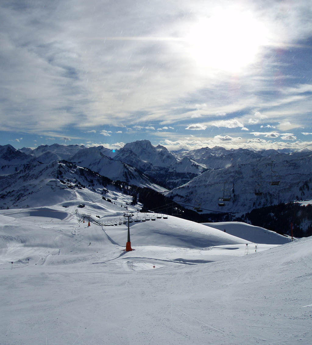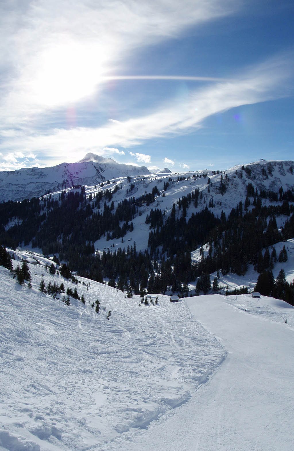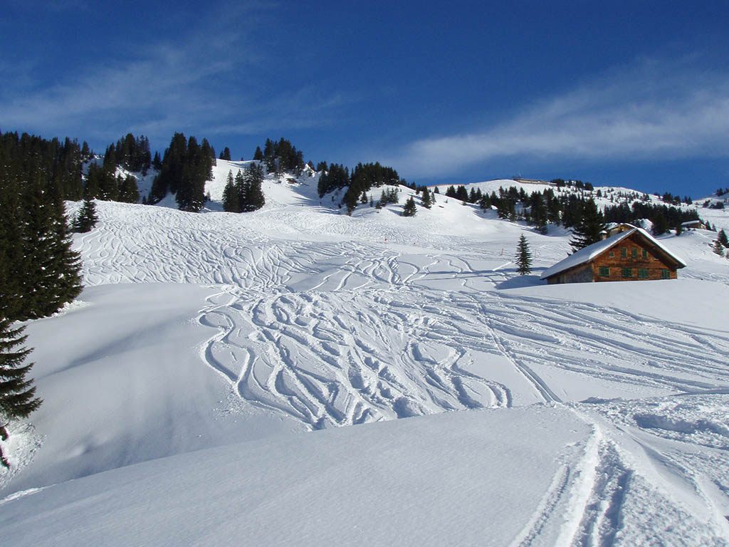Ich wollte an diesem Freitag Sonne haben und habe mir deshalb das föhnbevorzugte Gebiet Damüls-Mellau ausgeguckt. Wetter war schon auf der Fahrt besser als gedacht und ich kam um 8:30 in Mellau an. Wochentags und vor Weihnachten geht es dort ziemlich entspannt zu, so dass ich direkt vor der Kasse parken konnte.