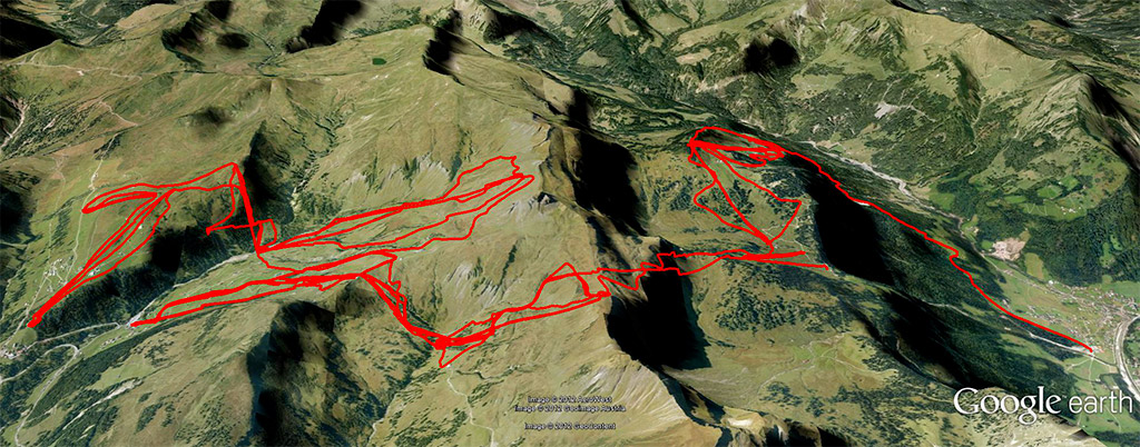 Track und Höhenprofil (erste Auffahrt von Mellau fehlt). Hab versucht ein Muster zu erzeugen, in dem ich jeden Lift dreimal gefahren bin. 😉
