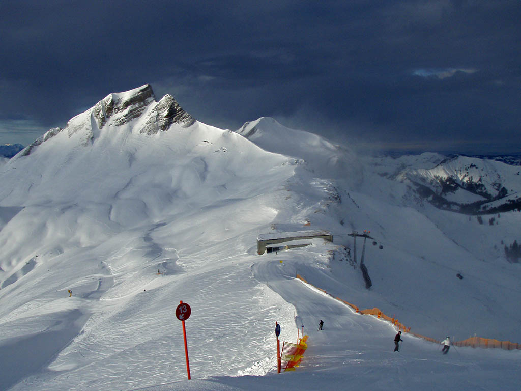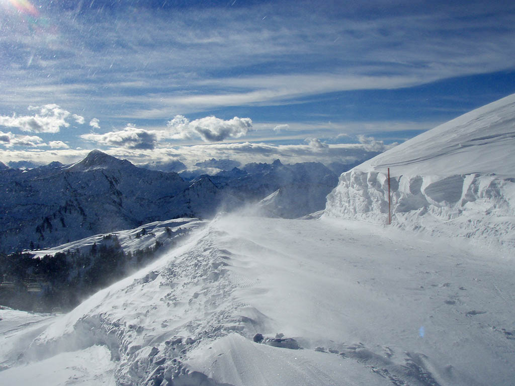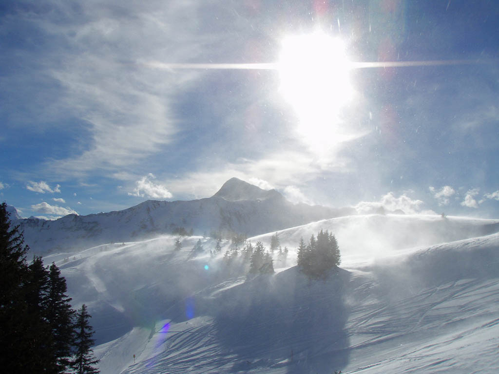 Nach schaukeliger Fahrt Ankunft an der Bergstation. Ich konnte auf Grund des Gegenwinds fast nicht losfahren. Wie man sieht, wurde auf allen Gipfeln der schöne Pulverschnee verweht.