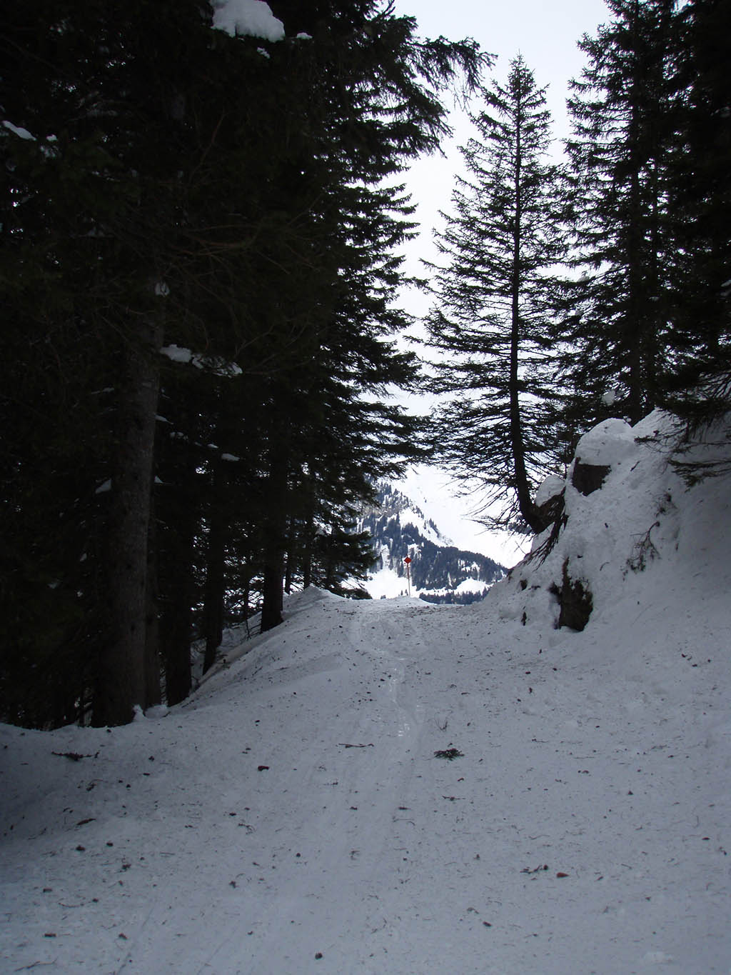 In Mellau deutlich ungemütlicher als in Damüls - schattig und stürmisch. Hier auf dem Weg zu den letzten Sonnenstrahlen auf der nicht geöffneten Route an der Suttis Sesselbahn. Die Bäume hat es dort ziemlich gebeutelt.