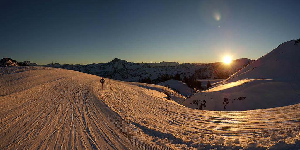 Danach aber wieder mehr in die Sonne zu Talstation der Zweier-Sesselbahn Sunnegg. Schnee pulvrig hart und gut präpariert.