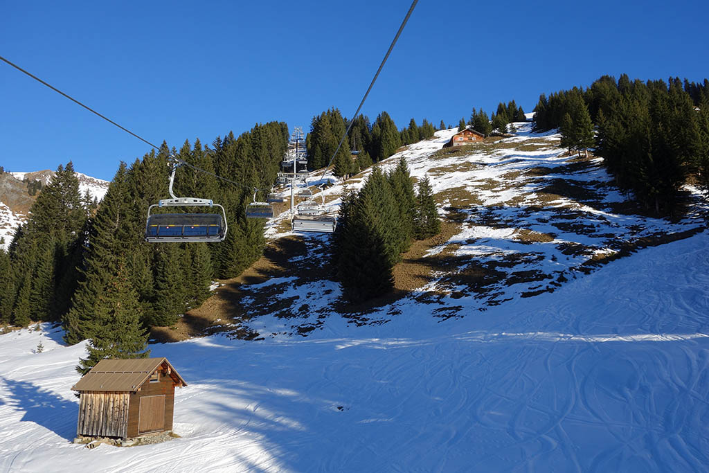 Danach hinauf mit der Sechser-Sesselbahn Hasenbühel. Wie man sieht hat's den Schnee auf den Südhängen schon ziemlich weggetrocknet.