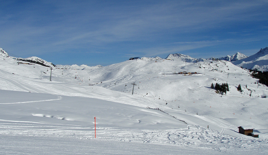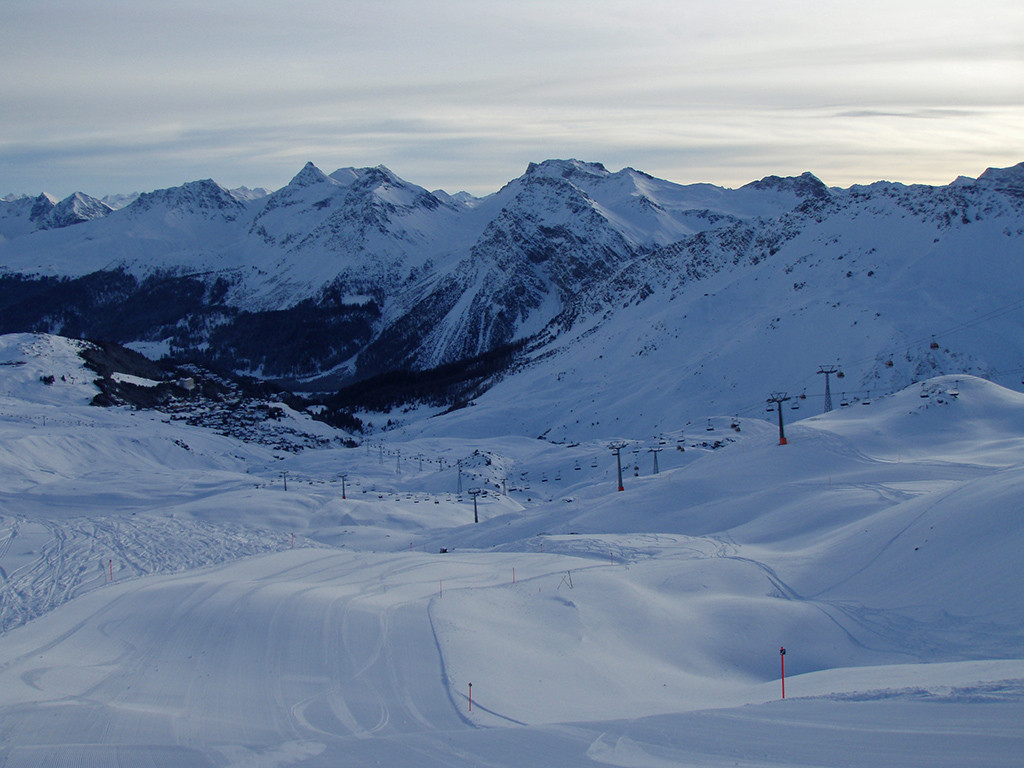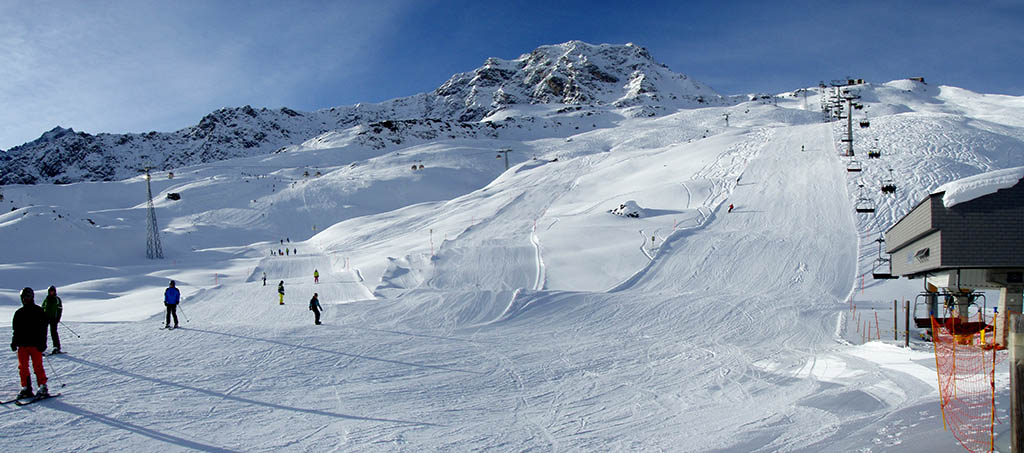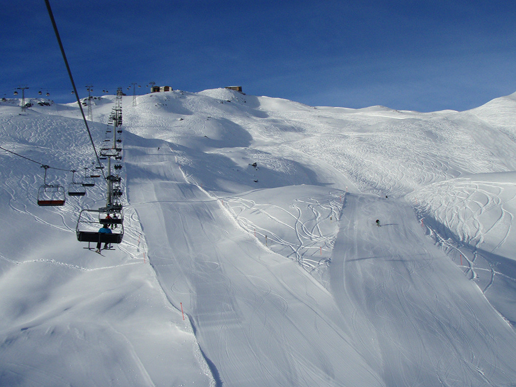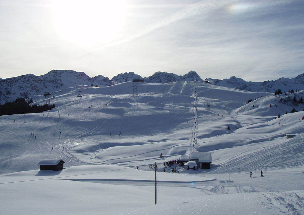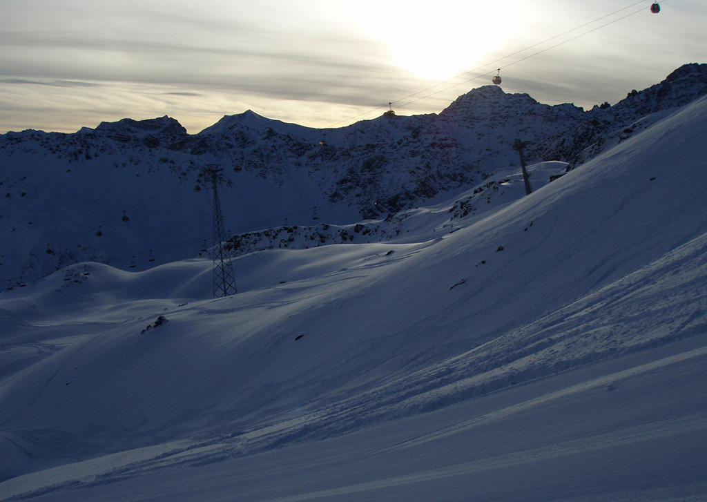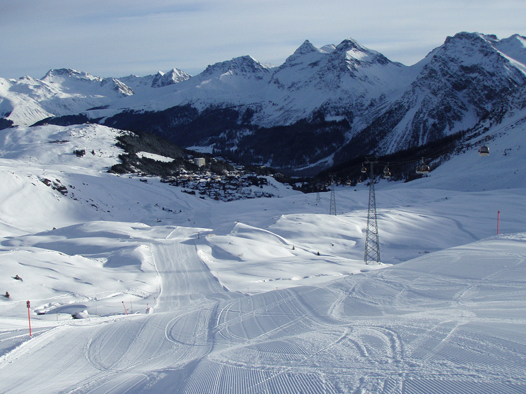 Die ersten Abfahrten an der Hörnli Vierer-Sesselbahn waren super. Ca. 10cm Neuschnee vom Vortag, noch leere Pisten und schön welliges Gelände.