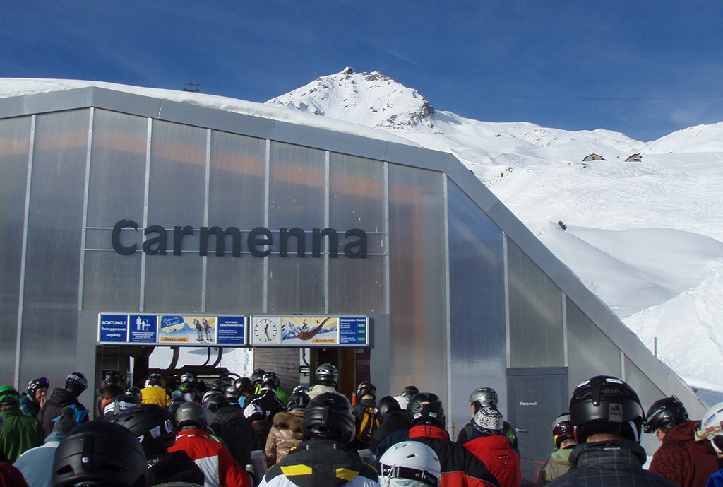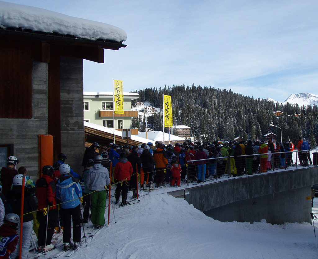 Auch an der Carmenna eine ordentliche Schlange. Da die Bahnen keine allzu große Kapazität haben, bleiben aber die Pisten in Arosa schön leer.