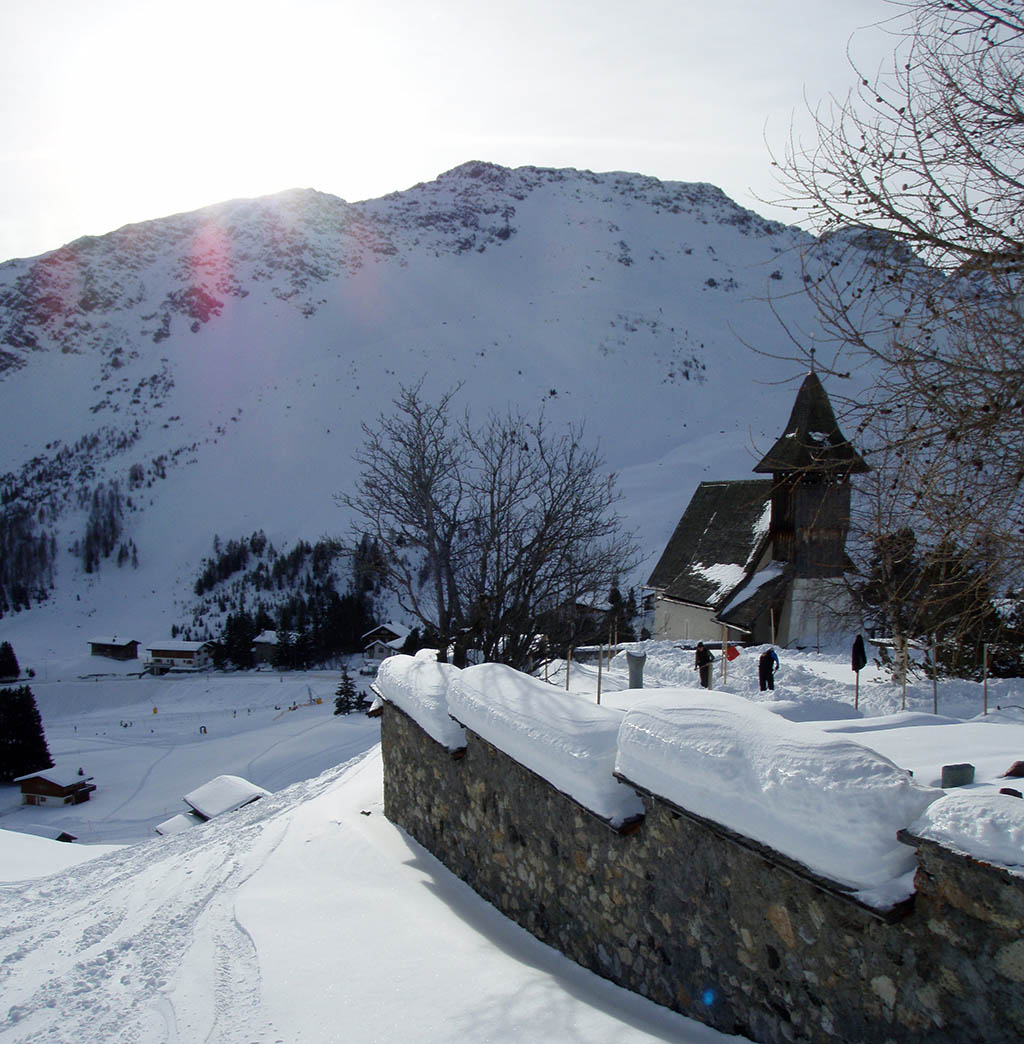 Anschließend hinunter zur Gondelbahn Innerarosa-Tschuggen vorbei an der Kapelle, bei dem zum Glück nur Schneegräber beschäftigt waren.