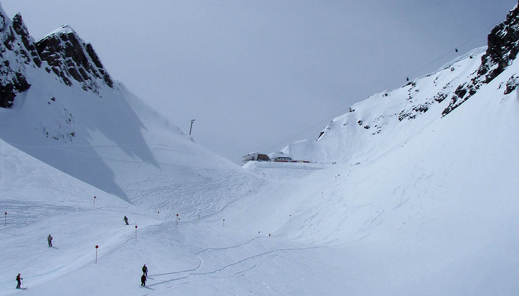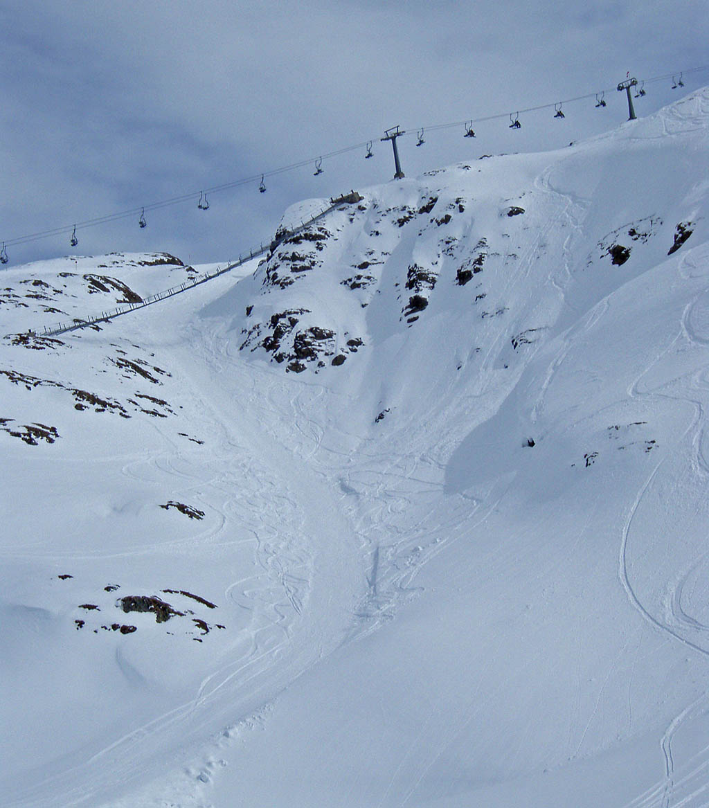 Auch hier die Routen planiert mit Neuschnee. Nur die Abfahrt von der Riffelscharte war recht schwer zu fahren: Geforene Buckel mit unterschiedlich viel Neuschnee.